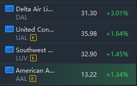 Airline Stocks Remained High in Morning Trading, With Delta Air Lines Rising Over 3% and United Continental Rising Nearly 2%