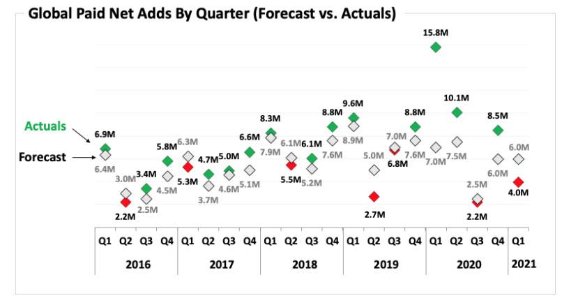 去年新冠疫情迫使多地出台居家禁足令,奈飞这样的互联网公司成为消费者室内支出猛增的受益者。华尔街机构此前预计到,随着各地复工,奈飞的用户增长会明显放缓。而奈飞最新公布的数据显然比市场预料的还差。