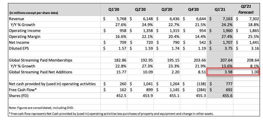4月21日消息,流媒体巨头奈飞$(NFLX)$在美股收盘后公布了2021年一季度财报。奈飞今年一季度的盈利和收入都高于市场预期,但用户增长大幅下滑,下降的幅度远超预期。盘后奈飞股价跳水,跌幅迅速超过10%,跌幅一度达到13%。如果周三收盘也保持10%左右的跌幅,将是2019年二季度以来奈飞季度财报公布次日的最大单日跌幅。美东时间本周二美股盘后,奈飞公布一季度稀释后每股收益(EPS)为3.75美元,同比增长139%,高于市场预期的2.98美元;当季营收同比增长24%,增至创纪录的71.6亿美元,市场预期71.4亿美元。
