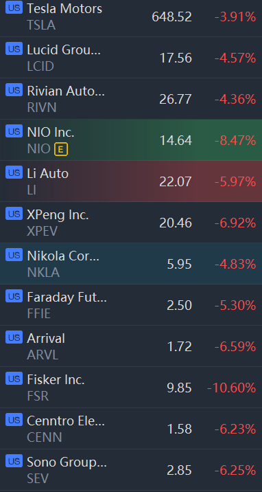 EV stocks dropped with the market in morning trading. Tesla, Lucid, Rivian, Nio, Xpeng Motors, Li Auto, Nikola, Arrival and Fisker fell between 4% and 11%.