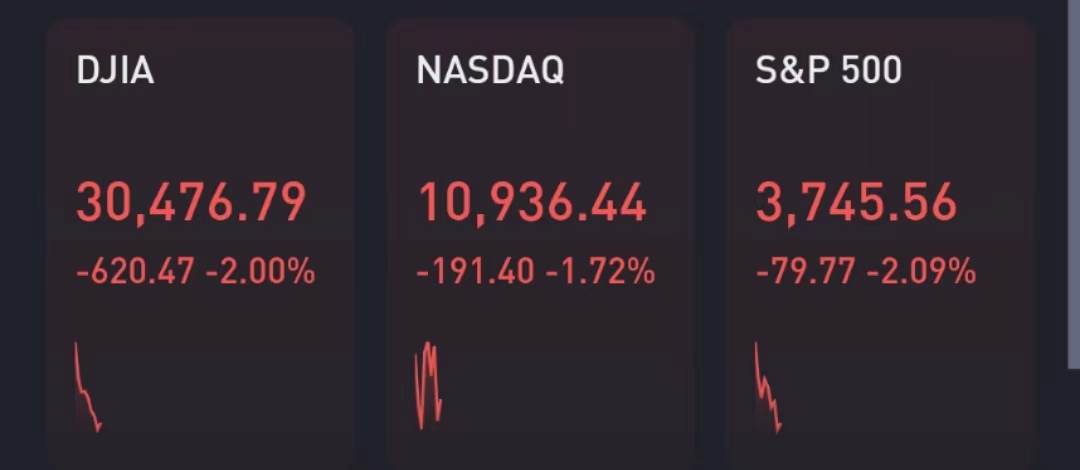 The Dow Jones Industrial Average fell about 620 points, or about 2%. The S&P 500 dipped 2.09%, and the tech-heavy Nasdaq Composite shed about 1.72%. The market has dropped in four of the past five weeks, and the S&P 500 is more than 20% below its record high.