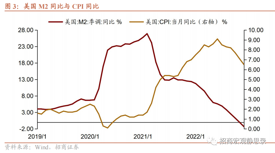 藏在细节中的“恶魔”:M2同比转负,虽将加速通胀回落、但亦是联储缩表结果。2020H2市场中出现了担忧美国高通胀的声音,主要逻辑就是M2同比出现了罕见的两位数增长,2021年2月M2同比增幅更是高达26.9%,为有数据以来最高。不出意外,2021H2-2022H1美国CPI同比如脱缰野马般快速、大幅攀升,高点曾达到9.1%,为1981年11月后最高。2022年12月美国M2同增降至-1.3%,为1959年以来首次转负。