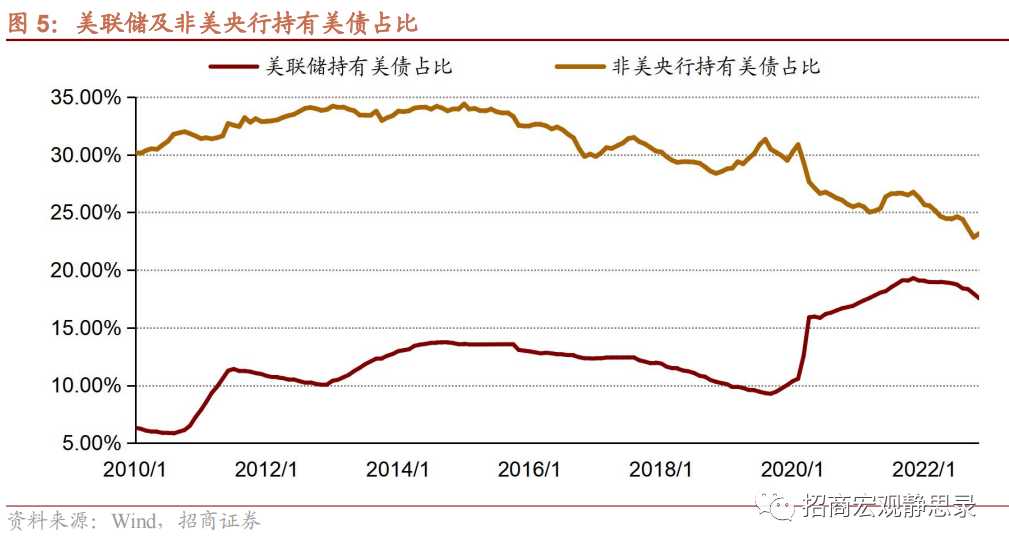 缩表冲击似乎正在显现:最舒服的日子已过,最差组合浮出水面。1)藏在细节中的“恶魔”:M2同比转负,为1959年以来首次,虽将加速通胀回落、但亦是联储缩表结果。可见,美联储缩表已经通过影响货币投放和信用派生对经济因素产生影响。2)缩表与非美央行减持美债双重约束下,10年期美债收益率中枢进一步下移难度增加。过去三个多月10年期美债收益率自4.25%降至3.39%表明市场更多地计入了经济因素降温的影响,但美联储缩表和非美央行减持美债以及未来上调债务上限对长端美债供需结构的影响尚未充分反应。尽管在经济衰退过程中,10年期美债收益率很难回升,但美联储及非美央行持续减持美债的动作也令10年期美债收益率暂时没有太多下降空间。