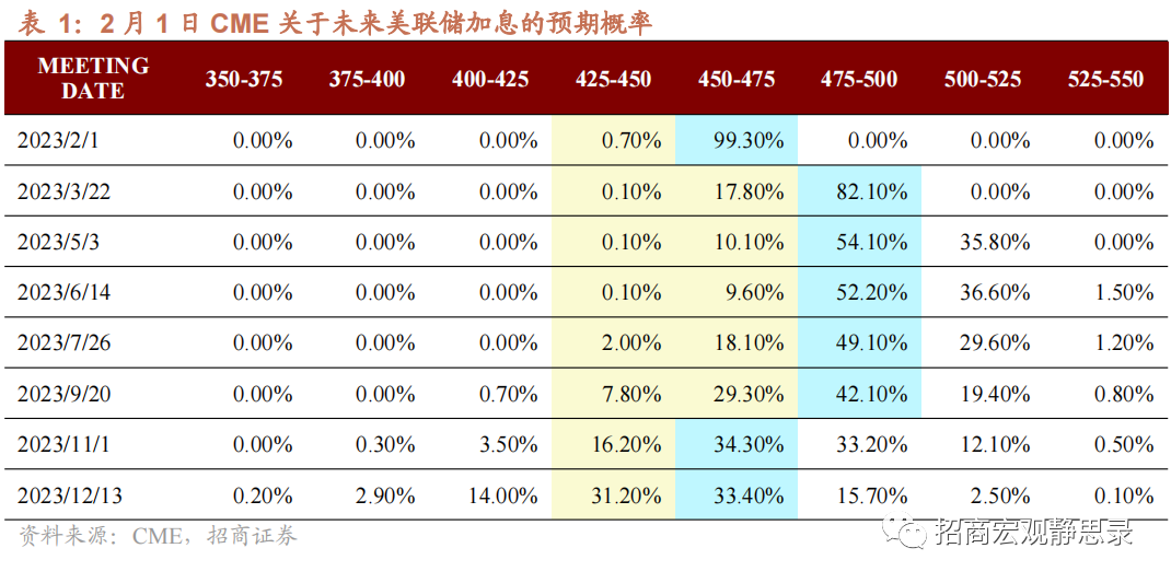 市场解读为鸽派,但似乎存在预期差风险。议息会议后,特别是鲍威尔讲话后,美债收益率明显回落、美股大涨、黄金也有一定表现,看上去市场将美联储连续减速加息解读为鸽派。但美联储操作并未超出会议前的市场预期,鸽派解读恐怕略显不妥。2月1日美联储议息决议公布前,市场对于美联储的操作预期就是本次议息会议加息25BP、3月加息25BP,随后停止加息,11-12月美联储将开始考虑降息。在声明公布后,鲍威尔在承认通胀放缓之余,亦表达了通胀仍高、就业市场仍有韧性等考虑,并且尚未提及结束缩表的时机,换言之,未来至少还会加息1次(如果数据仍强劲,不排除更多次加息的可能性,尽管这一可能性不高),本次美联储议息会议最多是兑现了会前的市场预期。