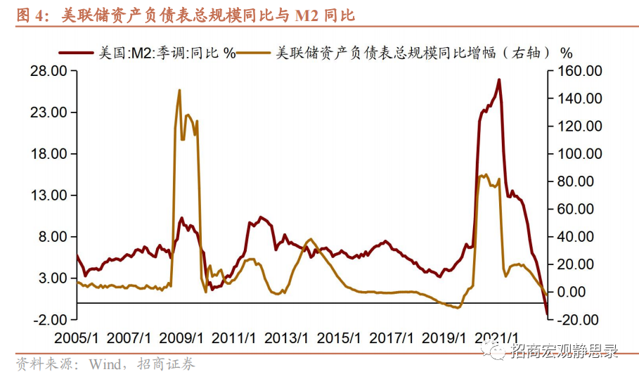 假若疫后美国M2的高企助长了通胀,那么M2同比转负理论上意味着美国通胀可能会超预期、快速、大幅回落,这一结论支持美联储快速结束加息。但问题在于M2同比增速为何会转负?答案是美联储缩表。如下图所示,每次美联储资产负债表规模的巨震都会加剧M2同比波动。2021年3月M2同比增速自高点回落之际刚好对应着美联储扩表速率拐点,美联储结束扩表后美国M2同增骤降、而M2同增转负则大概率是缩表的结果。换言之,美联储缩表已经通过影响货币投放和信用派生对经济因素产生影响。