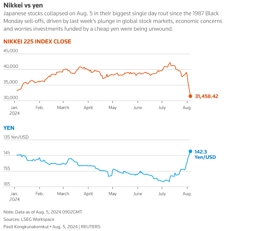 Instead, the answer likely lies in a further sharp position unwind of carry trades, where investors have borrowed money from economies with low interest rates such as Japan or Switzerland, to fund investments in higher-yielding assets elsewhere.