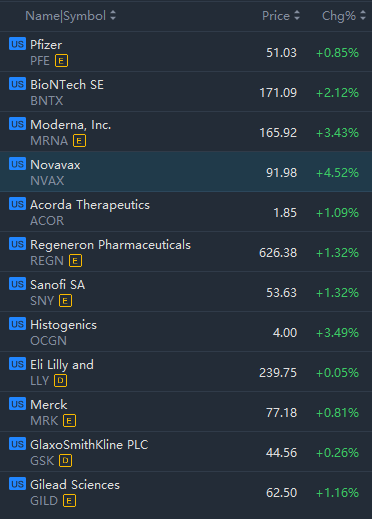 Vaccine stocks gained in morning trading, with Novavax rising over 4% and Moderna up 3%.