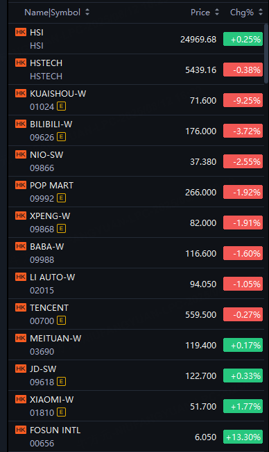 Kuaishou fell 9%; Bilibili fell 4%; Nio fell 3%; Alibaba fell 2%; Tencent fell 0.3%; Fosun Intl up 13%; Xiaomi up 2%.