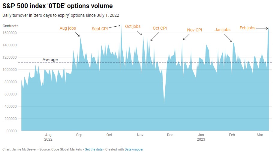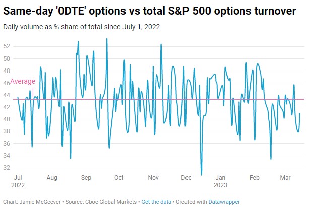 Data from Cboe Global Markets shows that '0DTE' options have grown in stature over the past several months. They have accounted for more than 40% of daily turnover in all S&P 500 index options since last July - a year ago it was around 20%.