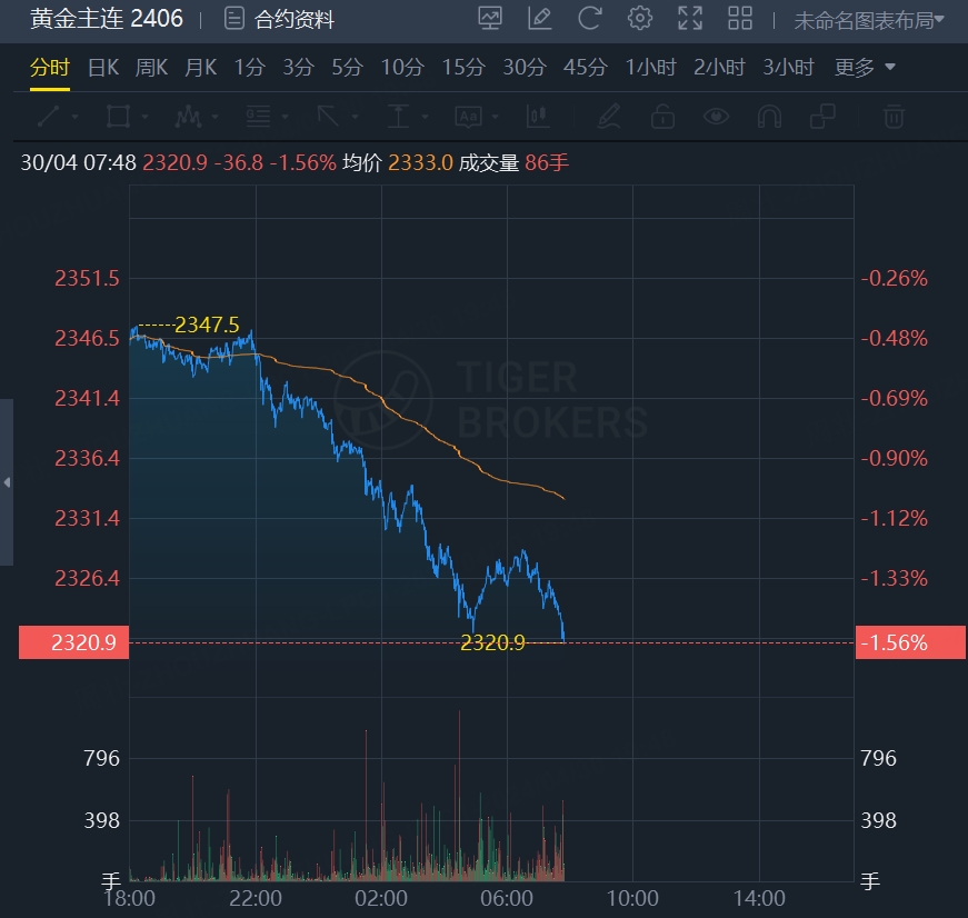 黄金期货日内走低,截止发稿,跌1.56%,报2320.9美元/盎司。