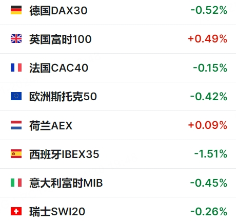 欧洲主要股指多数下跌,截至发稿,德国DAX30指数跌0.52%,英国富时100$涨0.49%,法国CAC40跌0.15%。