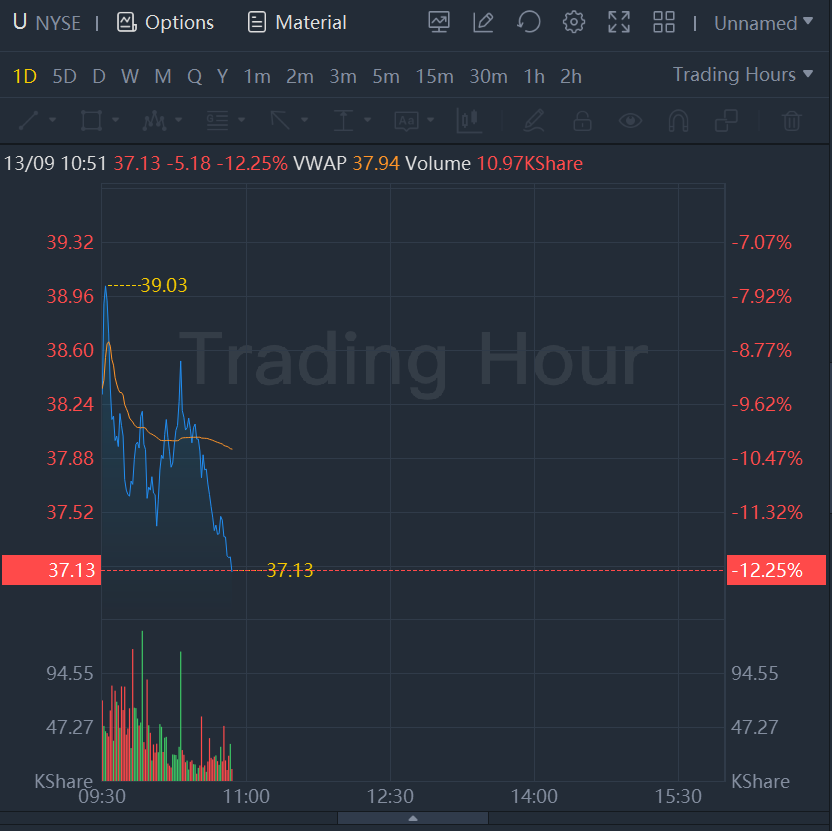 Sept 13 (Reuters) - Shares of Unity Software Inc(U.N)fell 12% on Tuesday after AppLovin Corp(APP.O)withdrew its buyout offer for the gaming software maker, cementing Unity's planned purchase of ironSource LtdUnity had last month rejected a $17.54 billion all-stock bid from AppLovin that included the condition its $4.4 billion pursuit of Tel Aviv-based ironSource cannot go ahead.