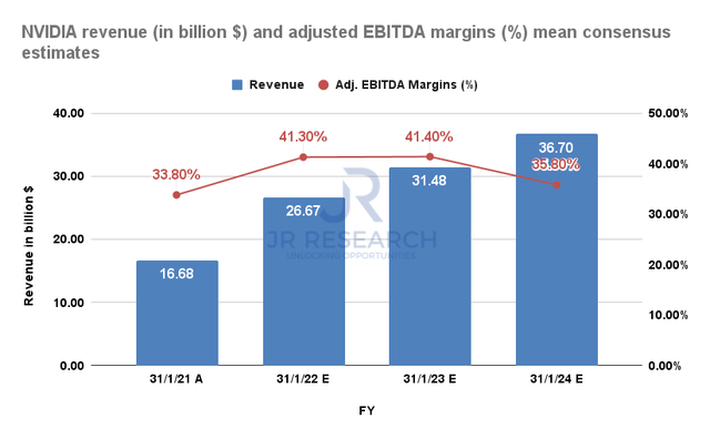 One of the central arguments against NVIDIA is its slowing revenue growth moving forward. Readers can observe that NVIDIA's revenue is estimated to increase at a CAGR of 30.1% through FY24. However, its YoY revenue growth is projected to reach 60% this year. Thus, it is a significant slowdown in growth over the next two years. Despite that, NVDA could still gain substantial operating leverage as it scales.