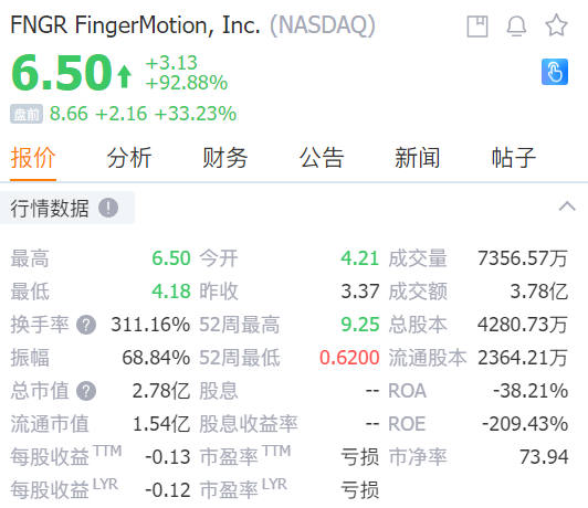 又一只妖股来袭!FingerMotion盘前涨超33%。该股上一交易日收涨92.88%,报6.5美元。公开消息显示,FingerMotion,Inc.致力于在中国市场提供移动支付和充值服务。它主要通过向中国联通和中国移动的客户提供这些服务来赚取收入。该公司于2014年1月23日创立,总部位于纽约州纽约。中概股盘前普涨,雾芯科技涨超4%, 拼多多、小鹏汽车涨超3%,哔哩哔哩、爱奇艺、阿里巴巴、网易、京东、百度、贝壳、理想汽车涨超2%。