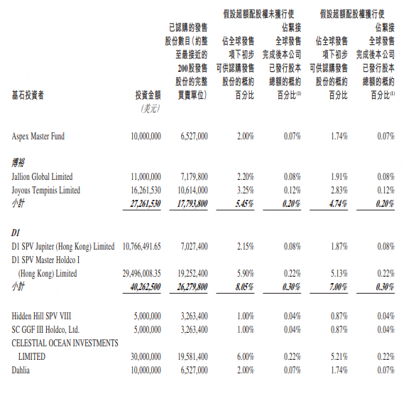 基石投资者已合共认购1.3亿股发售股份,相当于全球发售下发售股份数目的约39.88%,及上市后(超额配股权行使之前)公司已发行股本总额的约1.48%。老虎国际整理相关数据如下表: