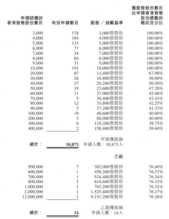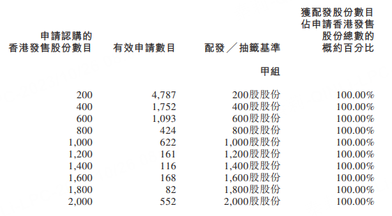 香港公开发售已获少量超额认购,已接获有效申请合计10887份,合计认购4435.72万股香港发售股份,相当于香港公开发售中初步可供认购的香港发售股份总数3265.52万股的约1.36倍。分配至香港公开发售的发售股份最终数目为3265.52万股B类股份,约占全球发售中(超额配股权行使之前)初步可供认购发售股份总数的10%,且已分配予10887名根据香港公开发售成功申请的申请人,其中获分配一手买卖单位发售股份的申请人合计4787名。