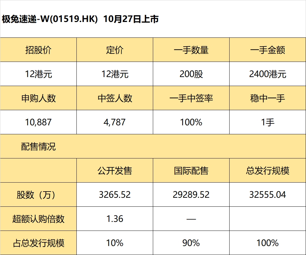 10月26日讯,极兔速递-W(01519)发布公告,按发售价每股发售股份12.0港元计算,公司将收取的全球发售募集资金净额预计约为35.28亿港元。每手200股,预计B类股份于2023年10月27日上市。