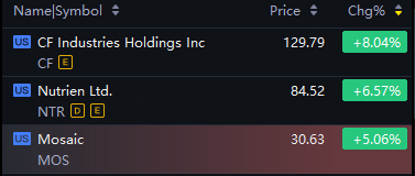 Fertilizer stocks rose in Thursday trading. CF Industries up 8%; Nutrien up 7%; Mosaic up 5%.