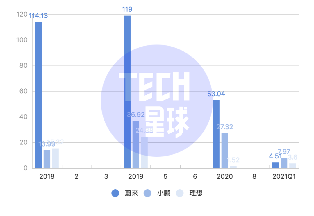 2018年-2021年1季度蔚来、小鹏、理想净亏损Tech星球简单算了一笔账,小鹏一季报显示,公司亏损7.87亿元,日均亏近900万元。同期交付1.33万台,平均每卖一辆车,亏掉6万块,以此类推,蔚来每卖一辆车,亏掉2.2万元;理想每卖一辆车,亏掉2.8万元,每一家都在越卖越亏的路上。