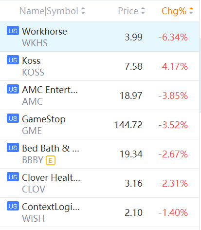 AMC, GameStop, Bed Bath & Beyond, Koss, Workhorse and WISH fell between 1% and 6%.