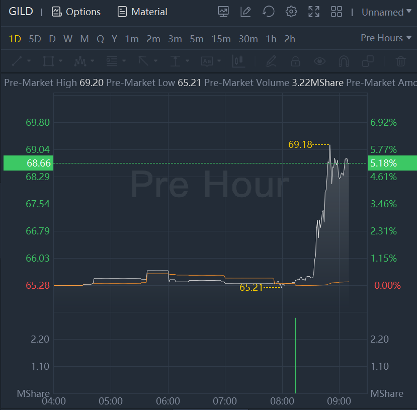 Shares of Gilead Sciences Inc. were up 5.2% in premarket trading on Monday after the company said in a securities filing that it settled a patent case that extends the exclusivity of its HIV franchise.