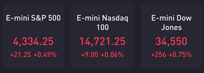 At 8:05 a.m. ET, Dow E-minis were up 256 points, or 0.75%, S&P 500 E-minis were up 21.25 points, or 0.49% and Nasdaq 100 E-minis were up 9 points, or 0.06%.
