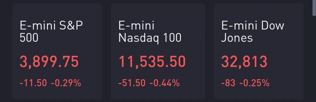 At 7:50 a.m. ET, Dow e-minis were down 83 points, or 0.25%, S&P 500 e-minis were down 11.5 points, or 0.29%, and Nasdaq 100 e-minis were down 51.5 points, or 0.44%.