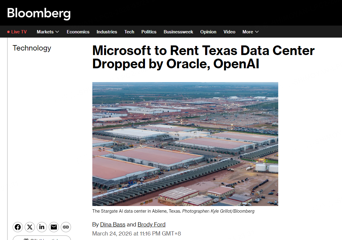 Representing about 700 megawatts of capacity, the site in Abilene is adjacent to Oracle’s and OpenAI’s flagship Stargate campus. Microsoft struck the deal with developer Crusoe after the two companies walked away from talks to occupy the site, said the people, who were granted anonymity to discuss a private matter.