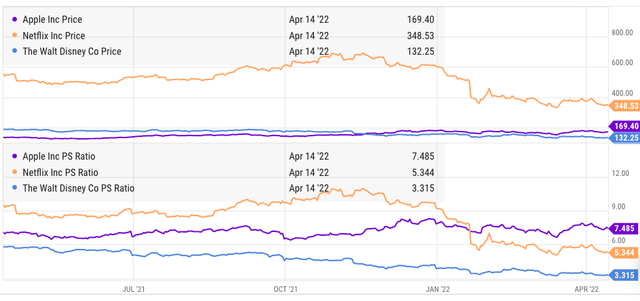 Figure 3: Comparison of price and P/S ratio of Apple, Netflix and Disney. Source: YCharts