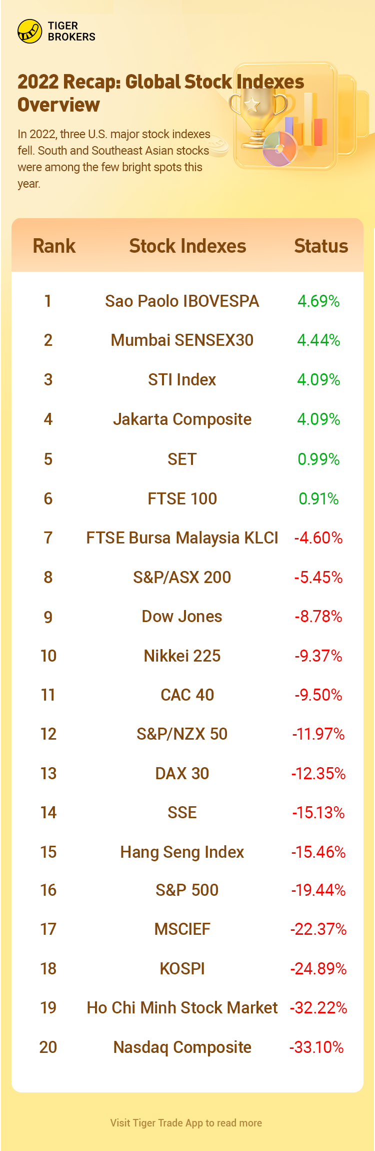 In 2022, the world’s major stock indexes have fallen more than risen, and Brazil’s IBOVESPA index ranked first with a 4.69% increase; due to the widespread sell-off of US technology stocks, the Nasdaq index fell by more than 30% for the whole year, reaching 33.10%, leading the decline in the world main stock market.South and Southeast Asian stocks were among the few bright spots this year for global funds as reopenings from the pandemic and a revival in tourism boosted corporate profits. Inflation has also remained relatively benign in parts of the region and improved current account balances helped reduce the impact from a stronger dollar.