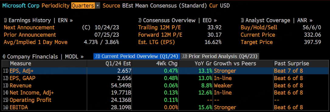 Azure's outlook for 2Q will likely be more critical compared to any other KPI when Microsoft reports fiscal 1Q24 results on Oct. 24, amid strong interest in generative AI. Microsoft has been the most vocal among large software vendors in launching new AI products, given its close relationship with OpenAI, which runs on Azure. Despite this, 2Q Azure estimates are up less than 0.5% since May and consensus calls for sales growth of 25% in constant currency. However, Bloomberg believe that any guidance of less than 28% for the quarter could be met with disappointment.