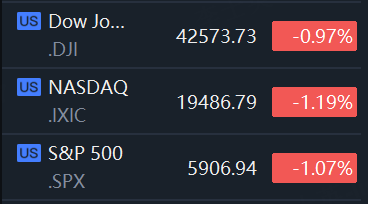 The Dow Jones Industrial Average fell 418.48 points, or 0.97%, to 42,573.73, the S&P 500 lost 63.90 points, or 1.07%, to 5,906.94 and the Nasdaq Composite lost 235.25 points, or 1.19%, to 19,486.79.