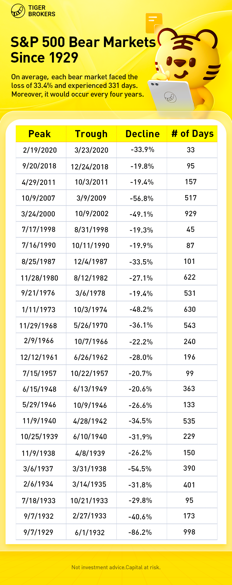 On average, each bear market faced a loss of 33.4% and experienced about 331 days. Moreover, it would occur nearly every four years.