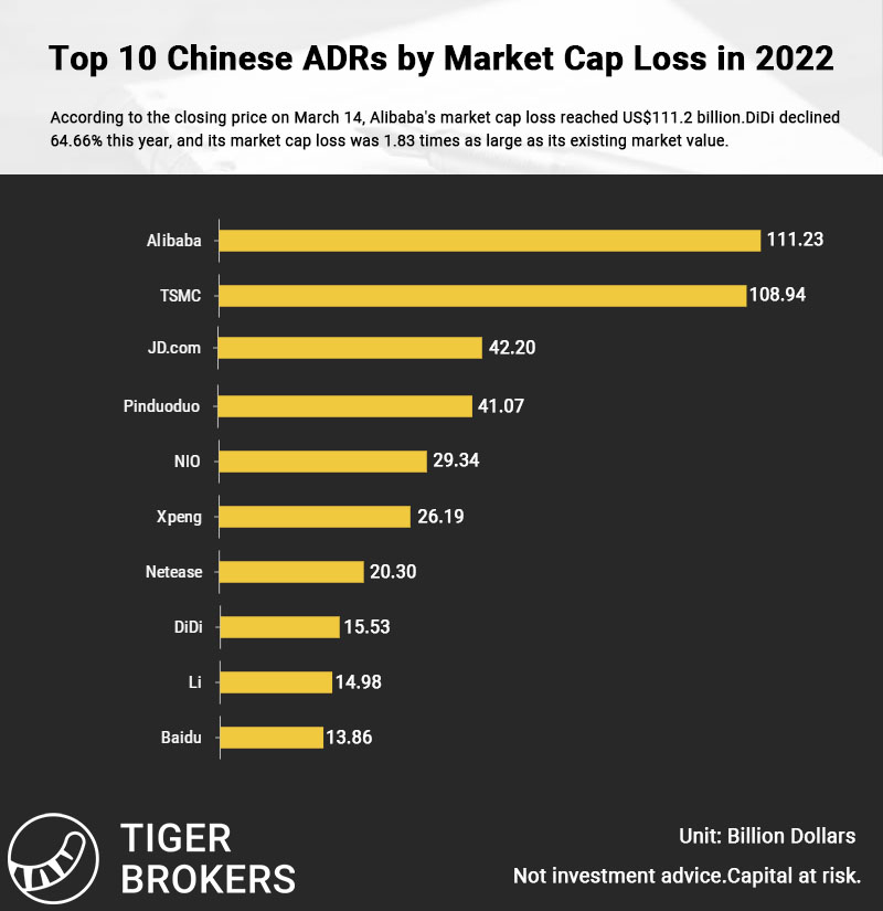 According to the closing price on March 14, Alibaba's market cap loss reached US$111.2 billion in 2022. DiDi declined 64.66% this year, and its market cap loss was 1.83 times as large as its existing market value.