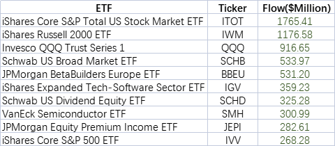 iShares Core S&P Total U.S. Stock Market ETF and iShares Russell 2000 ETF saw large inflows of $1765.41 million and $1176.58 million respectively, while BBEU saw inflows of$531.2million, reflecting that investors began bottom-hunting for European stocks.