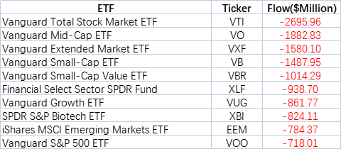 Vanguard Total Stock Market ETF ranks first among Top 10 ETF outflow. It slid 1.73% last Friday and hit a three-month low. However, another cap-weighted index fund iShares Core S&P Total U.S. Stock Market ETF saw an inflow of $1765.41 million. As a whole, investors were trying to keep away from them last week.
