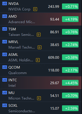 Semiconductor stocks jumped in morning trading, with AMD and Intel rising over 4%.
