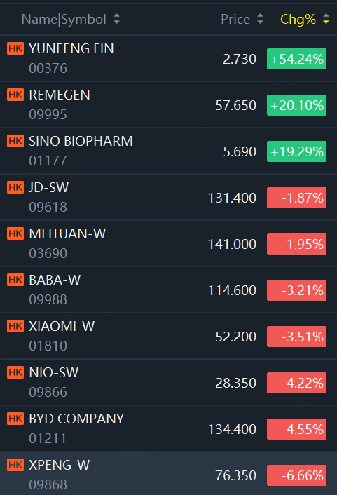In terms of sectors, the biotech sector saw significant gains. Remegen surged by 20.10%, Sino Biopharm rose by 19.29% after announcing a strategic partnership with a leading global pharmaceutical company; and Luye Pharma increased by 9.46%.