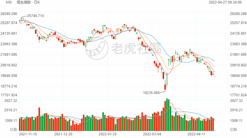 4月27日讯,隔夜美股大跌,港股三大指数集体低开,恒指跌1.06%,国指跌0.97%,恒生科技指数跌1.27%。