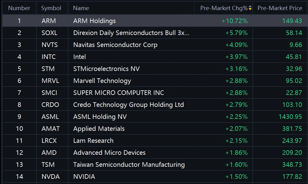 Chip stocks rallied in premarket trading. ARM Holdings up 10.7%; SOCL up 5.8%; Intel, Navitas up around 4%; Marvell, SMCI up around 3%.