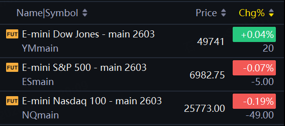 As of Jan 7, U.S. stock index futures are mixed, indicating a cautious tone before the opening bell. Dow futures edged higher, with the front contract up 0.04% at 49,741.00, while S&P 500 futures fell 0.07% to 6,982.75 and Nasdaq 100 futures fell 0.19% to 25,773. The setup suggests tech-heavy benchmarks may see modest pressure relative to the Dow as traders digest chip, AI, and crypto-linked headlines alongside energy developments.
