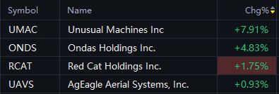 Drone makers advanced on Thursday. Unusual Machines up 8%; Ondas Holdings up 5%; Red Cat Holdings up 2%.