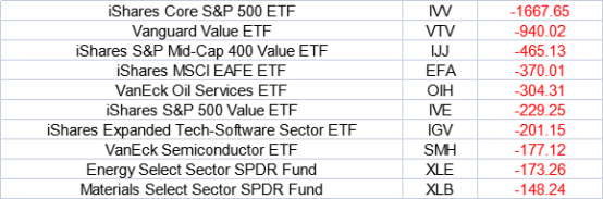 IVV ranks first among the Top 10 ETF outflow, with $1667.65 million running away. Another S&P500-related ETF IVE saw an outflow of $229.25 million.