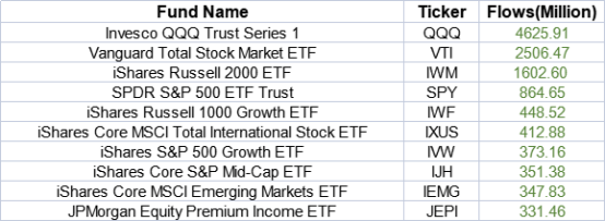 Last week, Invesco QQQ Trust saw the largest inflow of $4,625.91 million, IWF, IVW also saw the inflow of $448.52 million and $373.16million separately. All of them showed that investors have shown great interest in growth stocks.