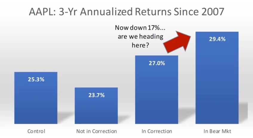 The argument for buying AAPL stock today is illustrated by the graph below. It represents the annualized return over a three-year period, if shares are bought at certain levels below all-time highs: not in a correction of 10%, in a correction, or in bear market (i.e. 20%-plus drawdown).