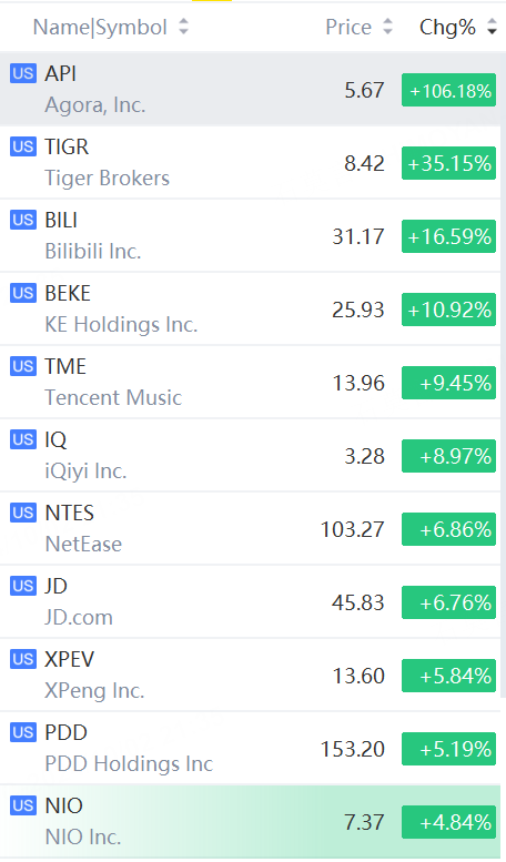 Agora soared 106%; Tiger Brokers rallied 30%; Bilibili rose over 16%; KE Holdings rose about 11%; NetEase, JD.com rose over 6%.
