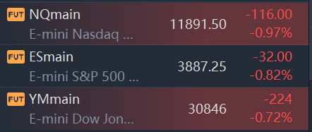 At 07:47 a.m. ET, Dow e-minis were down 224 points, or 0.72%, S&P 500 e-minis were down 32 points, or 0.82%, and Nasdaq 100 e-minis were down 116 points, or 0.97%.