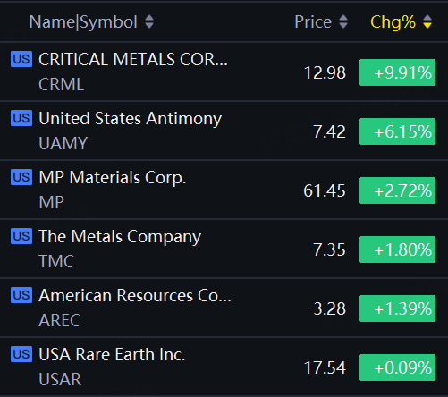 Rare earth shares gained on Wednesday. Critical Metals up 10%; UAMY up 6%; MP Materials up about 3%; The Metals up 2%.
