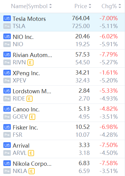 Tesla, Rivian, Nio, XPeng, Lordstown, Fisker and Canoo Inc. fell between 3% and 6%.
