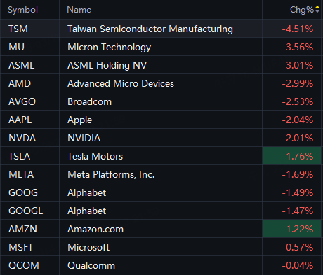 Big tech stocks fell in Thursday trading. TSMC down 5%; Micron down 4%; ASML, AMD down 3%; Nvidia, Tesla down 2%; Amazon, Alphabet down 1%.